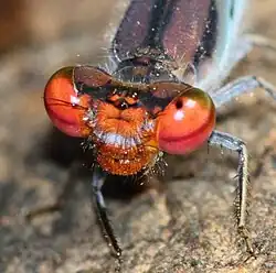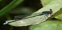 A medium-sized damselfly (length 32–41 mm; wingspan 42–48 mm).[2] The face is brick red and the front of the eyes are cherry-red; the back of the eyes are black above and green below; it has mauvish reddish brown post-ocular spots that are joined by a stripe of the same colour. The synthorax is mauvish brown (ageing to purplish brown) with black stripes above; the sides are light blue. The abdomen is black above and green below; segments eight and nine are bright blue with narrow black rings at their ends and segment ten is black above with bright blue sides.[3] Cerci are longer than paraprocts, which are hatchet shaped with a dorsal knob.[4]