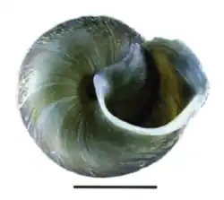 The shell has 4.5–52⁄3 whorls.[2] The width of the shell is 19.4–22.3 mm, and the height of the shell is 9.7–11.1 mm.[2]