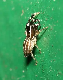 Pseudicius is a genus of the jumping spiders first described by Eugène Simon in 1885. The name is combined of Greek pseudo "false" and the salticid genus name Icius.[3] The small genus Wesolowskana (formerly known as Luxuria) should possibly be included in this genus.[4] There is some dispute whether Afraflacilla is a distinct genus or should be included in Pseudicius. Festucula and Marchena are other close relatives, these genera form a monophyletic group.[5]