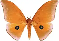 Under Side. Breast red-brown. Legs, abdomen, and wings entirely of a dark buff. All the faint waved lines, hardly discernible on the other side, are here very conspicuous. Close to the transparent spots, on the anterior wings, are two of a dark brown, and two larger are also placed close to the transparent ones in the posterior wings, without any of the circular ones which are on the upper side. Margins of the wings entire. Wing-span 7¾ inches (195 mm).[2]
