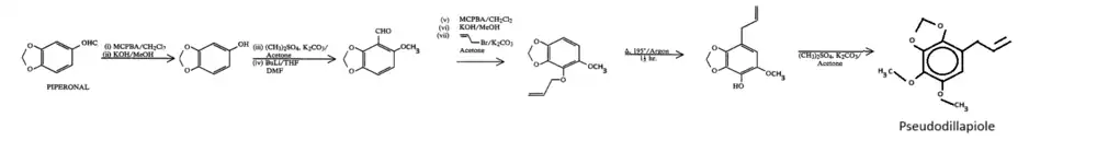 Pseudodillapiole (4,5-dimethoxy-2,3-methylenedioxy-1-allylbenzene) is a derivative compound of allylbenzene that acts synergistically with at least some insecticides, such as piperonyl butoxide, enhancing their insecticidal effect.[1] Pseudodillapiole can be used to synthesize a certain amphetamine derivative, 4,5-dimethoxy-2,3-methylenedioxy-1-amphetamine, also known as DMMDA-4, which is a positional isomer of DMMDA and DMMDA-2.[2] Alexander Shulgin noted this in his book PiHKAL.[2]