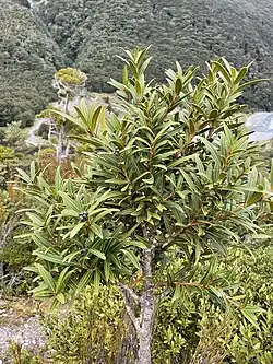 Adult leaves are shorter and slightly wider than juvenile leaves, being 5–10 cm (2.0–3.9 in) long and 0.75–1 cm (1⁄4–1⁄2 in) wide.[2] They are still thick but more linear-lanceolate in shape with a rounded obtuse or pointed acute leaf tip.[2] The adult leaves also grow on thick petioles, 5 mm long, but have a slightly less prominent toothed or smooth leaf margin.[2][5] Leaves are simple and alternate,[6] with adult leaves tending to crowd at the tips of the branchlets.[10]