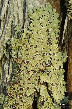 - ^ a b c d e f g Buaruang, Kawinnat; Scharnagl, Klara; Divakar, Pradeep; Leavitt, Steven D.; Crespo, Ana; Nash, Thomas H.; Manoch, Leka; Lücking, Robert; Lumbsch, H. Thorsten (2015). "Molecular data support Pseudoparmelia as a distinct lineage related to Relicina and Relicinopsis (Ascomycota, Lecanorales)". The Lichenologist. 47 (1): 43–49. doi:10.1017/S0024282914000577.