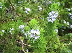 This plant has fine deep green linear leaves[3] that are deeply divided with a length of about 40 millimetres (2 in).[4] The linear leaf blades occur in crowded alternate spirals are 0.8 millimetres (0 in) to 2 millimetres (0 in) in width and taper from the base.[5] This plant blooms with white, lilac or blue pea shaped sweet smelling flowers between October and December.[6] in large clusters toward the end of the branches. Flowering is followed by the production of small pods, each of these contain a single dark brown seed.[7]