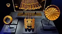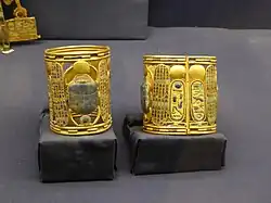 In spite of the destruction of wooden artifacts within the tomb due to the moist Nile delta area, the king's magnificent funerary mask was recovered intact; it proved to be made of gold and lapis lazuli and held inlays of black and white glass for the eyes and eyebrows of the object.[16] Psusennes I's mask is considered to be "one of the masterpieces of the treasure[s] of Tanis" and is currently housed in Room 2 of the Cairo Museum.[17] It has a maximum width and height of 38 cm and 48 cm respectively.[18] The pharaoh's "fingers and toes had been encased in gold stalls, and he was buried with gold sandals on his feet. The finger stalls are the most elaborate ever found, with sculpted fingernails. Each finger wore an elaborate ring of gold and lapis lazuli or some other semiprecious stone."[19]