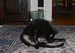 Grooming is a natural behavior for cats. Cats spend 5–25% of their waking hours grooming.[3] Grooming becomes excessive when it takes precedence over other activities or no longer seems functional.[2][3] Excessive grooming, which can lead to hair loss, skin wounds, and ulceration, can result from chronic stress or develop in cats who already exhibit nervous temperaments. Even when the source of stress is resolved or removed, excessive grooming may continue.[2] There may be some genetic basis for the behavior, and it predominantly affects purebred cats of oriental breeds, but can develop in any feline. Female cats appear more susceptible.[2] Environmental factors suspected of causing over-grooming include flea allergy, boredom, food allergy, dust or pollen causing an allergic reaction, constipation and urinary tract infection caused by avoidance of a dirty litter tray, dermatitis, and anxiety caused by inconsistent meal times. Deprivation of sunlight could be the part of the problem for indoors only cats.