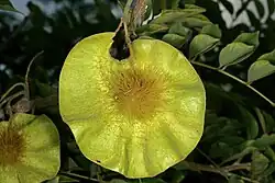 It is a deciduous tree usually growing to 16 m tall, with dark brown bark and a high, wide-crowned canopy of shiny compound leaves. In favoured wetter locations the trees are typically about 18–19 m tall. The leaves appear at the time of the flowers or shortly afterwards. They are alternate, deep green, imparipinnate, with 11-19 subopposite to alternate leaflets, the leaflets 2.5–7 cm long and 2–4.5 cm broad. It produces an abundance of scented, orange-yellow flowers in panicles 10–20 cm long; flowering is in the spring. In southern Africa, this is usually just at the end of the dry season, often about mid-October. The pod is 2–3 cm diameter, surrounded by a circular wing 8–12 cm diameter, reminiscent of a brown fried egg, and containing a single seed. This brown papery and spiky seed pod stays on long after the leaves have fallen. In poorly drained locations, the tree can still grow but it becomes more open in shape with leaves on the end of long branches - a 'stag-headed' appearance.[5][6] It is referred to as a blood wood tree: when it is cut, it appears to bleed because of dark red sap.[7]