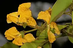 Pterocarpus angolensis (African teak, wild teak, Portuguese: Girassonde, Afrikaans: Kiaat, Sotho: Morôtô, Tswana: Mokwa, Venda: Mutondo, Shona: Mukwa, Tsonga: Mvhangase, Ndebele: Umvangazi,[2] Shona: Mubvamaropa, Zulu: Umvangazi)[3] is a species of Pterocarpus native to southern Africa, in Angola, Mozambique, Namibia, South Africa, Eswatini, Tanzania, Democratic Republic of the Congo, Zimbabwe, and Zambia.[4] It is a protected tree in South Africa.[3] The name Kiaat, although Afrikaans, is sometimes used outside South Africa as well. In Zimbabwe, depending on what region you are in, it is known as Mukwa( which it is also called in Zambia) or Mubvamaropa.