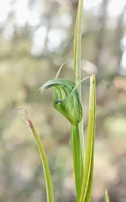 Pterostylis graminea is a terrestrial, perennial, deciduous, herb with an underground tuber. It has between four and six erect, linear to lance-shaped, grass-like leaves which are V-shaped in cross-section, 80–150 mm (3–6 in) long and 5–10 mm (0.2–0.4 in) wide. The top-most leaves are the longest and are higher than the flower. There is a single yellowish green flower with transparent white stripes borne on a flowering stem up to 330 mm (10 in) high. The dorsal sepal and petals are fused, forming a hood or "galea" over the column. The dorsal sepal is more or less erect near its base then suddenly curves forward then below horizontal. The petals are slightly flared and slightly shorter than the dorsal sepal. There is a wide gap between the lateral sepals and the galea and the lateral sepals have thread-like tips which are erect, spread slightly apart from each other and are higher than the galea. The labellum is greenish-brown, darker near the tip, curved and protrudes above the sinus. Flowering occurs between September and January.[2][3]