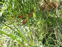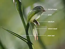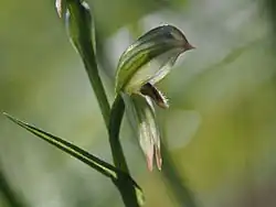 Pterostylis longifolia, is a terrestrial, perennial, deciduous, herb with an underground tuber. Non-flowering plants have a rosette of between three and six, linear to lance-shaped leaves, each leaf 10–40 mm (0.4–2 in) long and 3–4 mm (0.1–0.2 in) wide. Flowering plants have up to seven green, partly transparent flowers on a flowering spike 150–400 mm (6–20 in) high. The flowering spike has between five and eight stem leaves which are 30–90 mm (1–4 in) long and 3–5 mm (0.1–0.2 in) wide. The flowers are 12–14 mm (0.5–0.6 in) long, 6–8 mm (0.2–0.3 in) wide. The lateral sepals turn downwards and have a tapering tip, 10–12 mm (0.4–0.5 in) long, 5–7 mm (0.2–0.3 in) wide. The labellum is about 5 mm (0.2 in) long, 3 mm (0.1 in) wide, pale green and hairy with a dark stripe along its mid-line. Flowering occurs from April to September.[2][3]