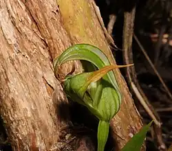 Pterostylis patens, commonly known as tutukiwi or greenhood, is a terrestrial, perennial, deciduous, herb with an underground tuber. Both flowering and non-flowering plants have between four and six erect, lance-shaped leaves which are 50–180 mm (2–7 in) long, 10–20 mm (0.4–0.8 in) wide and grass-like. Flowering plants have a single green flower with white stripes which is prominently inflated near its base. The dorsal sepal and petals are fused, forming a hood or "galea" over the column. The dorsal sepal is 40–50 mm (1.6–2.0 in) tall and curves forward then downward, tapering to a thin tip 30 mm (1 in) long. There is a wide gap between the galea and the lateral sepals which spread apart from each other, with long, thread-like tips up to 30 mm (1 in) long which sometimes almost meet behind the ovary. The labellum is flat in cross-section gently curved and protrudes above the sinus between the lateral sepals. Flowering occurs from February to April.[2][3]