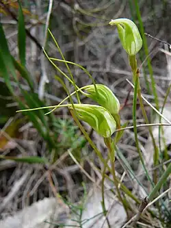 Pterostylis pedoglossa, commonly known as the prawn greenhood,[2] is a species of orchid that is endemic to south-eastern Australia. There is a rosette of leaves at the base and flowering plants have a single white flower with green stripes, sometimes with a brownish tinge on the tip, and a long, thread-like labellum.