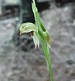 Pterostylis tunstallii, commonly known as Tunstall's greenhood[3] or granite greenhood[4] is a plant in the orchid family Orchidaceae and is endemic to south-eastern Australia. Flowering plants have up to ten transparent green flowers which have a dark brown, insect-like labellum with a blackish "head". Non-flowering plants have a rosette of leaves on a short stalk but flowering plants lack the rosette, instead having five to eight stem leaves.