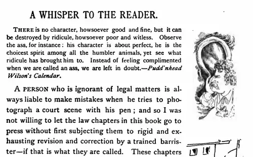 5. ^ "For some years Wilson had been privately at work on a whimsical almanac, for his amusement—a calendar, with a little dab of ostensible philosophy, usually in ironical form, appended to each date; and the Judge thought that these quips and fancies of Wilson’s were neatly turned and cute; so he carried a handful of them around, one day, and read them to some of the chief citizens. But irony was not for those people; their mental vision was not focussed for it. They read those playful trifles in the solidest earnest, and decided without hesitancy that if there had ever been any doubt that Dave Wilson was a pudd’nhead—which there hadn’t—this revelation removed that doubt for good and all. That is just the way in this world; an enemy can partly ruin a man, but it takes a good-natured injudicious friend to complete the thing and make it perfect. After this the Judge felt tenderer than ever toward Wilson, and surer than ever that his calendar had merit" (pp. 70–71).