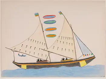 Pudlo's art is characterized by a playful sense of humour and a fascination with the trappings of modern life, especially airplanes. His early drawings are simple outlines made with lead pencil. In the mid-1960s, Pudlo began to work with coloured pencils and felt-tipped pens, and his art became more elaborate. In many ways Pudlo's work symbolizes the paradoxes of the encounter between traditional Inuit culture and modern life.