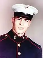 MIGUEL RIVERA-SOTOMAYORCorporal, U.S. Marine CorpsCompany F, 2d Battalion, 9th Marines, 3rd Marine Division (Rein.)Citation:The President of the United States of America takes pleasure in presenting the Navy Cross to Corporal Miguel A. Rivera-Sotomayor (MCSN: 2174861), United States Marine Corps, for extraordinary heroism while serving as a Grenadier with Company F, Second Battalion, Ninth Marines, THIRD Marine Division (Reinforced), Fleet Marine Force, in Quang Tri Province, Republic of Vietnam, on 29 July 1967. While moving in a battalion-sized operation in connection with Operation KINGFISHER, the entire battalion was attacked by a large element of the North Vietnamese army and began receiving a heavy barrage of mortar, rocket and automatic weapons fire. The Third Platoon of Company F, called to the front of the battle, was pinned down in a heavy cross fire from enemy machine guns. Receiving a call, for his support, Corporal Rivera-Sotomayor responded immediately, though he had been painfully wounded in the arm by shrapnel earlier in the battle. Rushing out into the direct line of enemy fire, with utter disregard for his own safety, he fired his complete supply of ammunition. His firing was so effective that it completely silenced the enemy machine guns and allowed his platoon to move from its pinned down position to establish an effective base of fire against the enemy. With his ammunition expended, Corporal Rivera-Sotomayor observed a machine-gun team whose members were too seriously wounded to fire their gun. Running across the opening in which he was standing, through intensifying enemy automatic rifle fire, he quickly loaded it and again, with no thought of his intense pain or severe wound, stood up with the gun and fired several rounds. Observing that the enemy was shifting positions, he grabbed a rifle and struggling into the open from his covered position, he fired a complete magazine of ammunition. Returning as quickly as possible for another magazine, he had to be restrained by a Corpsman from going out again. By his daring actions and loyal devotion to duty in the face of personal risk, Corporal Rivera-Sotomayor upheld the highest traditions of the Marine Corps and the United States Naval Service. Authority: Navy Department Board of Decorations and Medals[22]