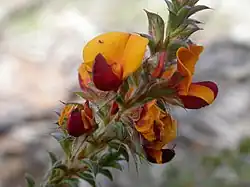 Pultenaea procumbens, commonly known as heathy bush-pea,[2] is a species of flowering plant in the family Fabaceae and is endemic to south-eastern continental Australia. It is a low-lying or spreading shrub with lance-shaped or rhombic leaves and yellow, orange and red flowers.