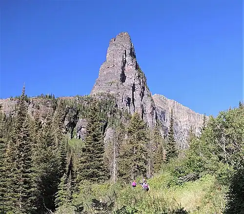Pumpelly Pillar (7,625 feet (2,324 m)) is located in the Lewis Range, Glacier National Park in the U.S. state of Montana.[3] Located in the Two Medicine region in the southeastern section of Glacier National Park, the peak is likely named after Raphael Pumpelly, who lead the Northern Transcontinental Railway Survey party that crossed Pitamakan Pass in 1883.[4]
