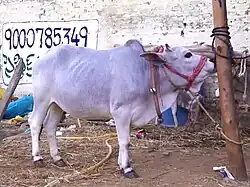 It is among the smallest of zebuine cattle breeds: bulls stand some 107 cm and weigh about 240 kg, cows average 97 cm in height and 170 kg in weight.[2] The coat may be white, grey, brown, red, or rarely black.[3]: 94 The horns are small and of crescent shape.[2]