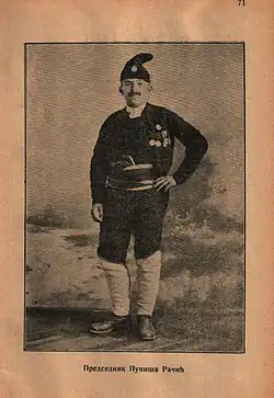 Puniša Račić was born on 12 July 1886 in the village of Slatina, near Andrijevica, Principality of Montenegro.[1] He entered the employ of politician Nikola Pašić as a sixteen-year-old in 1902. Pašić regarded Račić as a son and encouraged his political ambitions. Račić became active in Serbian nationalist circles and claimed to have organized assassination attempts against King Ferdinand I of Bulgaria, King Constantine I of Greece and Emperor Wilhelm II of Germany. Following World War I, he earned a reputation for suppressing pro-Bulgarian movements in Macedonia.[2] He was one of many Chetnik leaders who formed Serbian cultural societies in the region.[3] On 27 September 1927,[4] he was elected to the parliament of the Kingdom of Serbs, Croats and Slovenes as a representative of the People's Radical Party (NRS).[5]