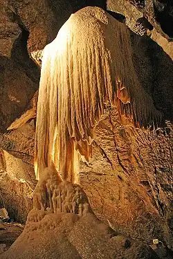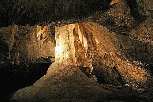The Punkva Caves (Czech: Punkevní jeskyně) are a cave system of the Czech Republic located north of the city of Brno, near the town of Blansko. The Punkva River flows through it. Part of it is the Macocha Abyss, its sinkhole is about 138.7 meters deep and also the deepest of its kind (light hole type) in Central Europe. It is a popular tourist attraction for casual visitors to the region, in addition to cavers and advanced technical divers.
