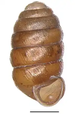 The shell of this species is dark to brown, translucent and thin, with fine and distinct growth lines, 6-7.5 whorls with deep suture, outline elongate and broad, aperture rounded with weakly developed lip, usually toothless, or with weak parietal and occasionally a palatal tooth, sometimes with weak cervical callus.[6]