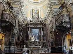 To the left of the altar is the funeral monument of Giulio Mastrillo, by Andrea Vaccaro. Above the main altarpiece in the cupola is a canvas by Giacomo Farelli: St Anne offers the child Virgin Sant’Anna to God the father (1670) as well as a Victory of St Michael (165) by Girolamo De Magistro.[2]