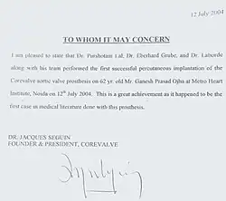 ^First-In-Man Experience of Percutaneous Aortic Valve Replacement Using Self-Expanding Core Valve Prosthesis – P Lal, PT Upasani, S Kanwar, A Parihar, R Arora, E Grube, JC Laborde : Indian Heart J 63: 3, 241 -244, 2011.