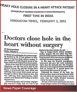 In September 1992, Purshotam Lal performed a non-surgical closure of an Atrial Septal Defect (ASD) on a 19-year-old patient.[27] The procedure utilized a device, made of nylon mesh named - MonoDisk, being it the first case of the world using MonoDisk Device.[28][29][30][31]