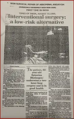 ^Paper Presented and published in Indian Heart Journal ( (1st Scientific Paper of the Country in 1992). P. Lal, PT Upasani et al: Non-Surgical Repair of Abdominal Aortic Aneurysms - Initial