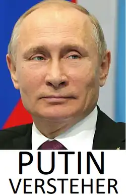 Putinversteher or Putin-Versteher (pronounced [ˈpuːtiːnfɛɐ̯ˌʃteːɐ] ⓘ, female form Putinversteherin) is a German neologism (Putin + verstehen), which literally translates to "Putin understander", i.e. "one who understands Putin".[1] It is a pejorative reference to politicians and pundits who express empathy to Vladimir Putin and may also be translated as "Putin-Empathizer".[2] Similar words include Russlandversteher and Russland-Versteher ("Russia-Empathizer").[3]