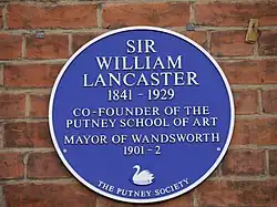 Local politician and philanthropist Sir William Lancaster, eminent Judge Baron Pollock, and British statesman Sir Arthur Jeff founded[1] the school in 1883.[2] For the first 11 years the school was based in parish offices on Putney High Street,[3] until the building on Disraeli road, designed by John W. Wallis, opened on 2 October 1895.[4] It has six studios, one on the first floor with large north-facing windows and a vaulted wooden ceiling.[5]