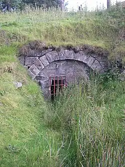 Thomas Hill extended the early tunnel through the hill to form a tramroad tunnel from Blaenavon to Pwll Du to carry limestone and coal.[6] The tunnel, high enough for horse drawn trams, runs through the Mynydd Garn Fawr in a sweeping curve.[2] The horse drawn railway through the tunnel was in operation by 1817. Limestone was taken from the quarry up to the railway by a water-balance lift, using water from a reservoir above.[3]