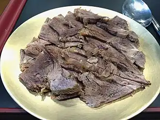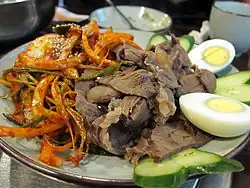 It is eaten as anju (an accompaniment to alcoholic drinks), or used as a topping for other dishes such as naengmyeon (cold noodles) and seolleongtang (ox bone soup).[3] In the past, pyeonyuk was made during the preparation of a large amount of beef stock or broth for various dishes served during feasts and banquets.[4] Today, it is also used in non-traditional dishes, such as a cold cut in wrap sandwiches, and is considered to be a healthier alternative to deep-fried, stir-fried, or roasted meat.[3]