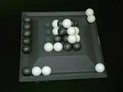 Each player starts off with 15 balls. Players take turns taking pieces from their reserve pile, and placing them on a 4x4 game board made up of 16 indentations. When four pieces are placed next to each other in a square, one piece can be put on top of the square. If the square is completed with all the same color, the player of that color may take one or two of their own pieces from the board (one or two that are not supporting anything) and put it back into their reserve pile. At the end of the game, the game board should have 4 levels. The first level with 16 pieces, the second level with 9 pieces, the third level with 4 pieces, and the fourth level with 1 piece. A player wins if they put the last piece on the 4th level, or if the other player runs out of pieces to play.[2]