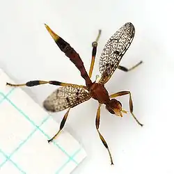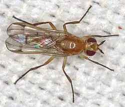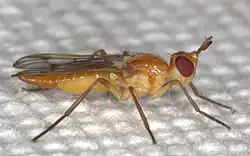 The Pyrgotidae are an unusual family of flies (Diptera), one of only two families of Cyclorrhapha that lack ocelli. Most species are "picture-winged" (i.e., have patterns of bands or spots on the wings), as is typical among the Tephritoidea, but unlike other tephritoids, they are endoparasitoids; the females pursue scarab beetles in flight, laying an egg on the beetle's back under the elytra where the beetle cannot reach it. The egg hatches and the fly larva enters the body cavity of the beetle, feeding and eventually killing the host before pupating. In the United States, some species of Pyrgota and Sphecomyiella can be quite common in areas where their host beetles (typically the genus Phyllophaga, or "June beetles") are abundant. Like their host beetles, these flies are primarily nocturnal, and are often attracted to artificial lights.[2][3]