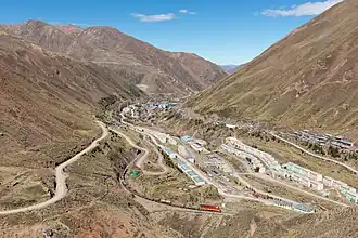 ![]() The mining village of Q'asa P'allqa (Casapalca) and the eastern slope of Qanchis Kancha (on the right) as seen from Jirish Mach'ay, looking to the south. | |