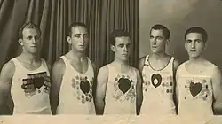 His athletics career started when he entered the Technical School in Tirana. From 1924 to 1928 he took some first and second prizes in the annual Olympic Games that were held in Tirana. He had his best results in high jump, pole vault and triple jump where he became national champion. In 1929 he was invited to join his hometown club, Bashkimi Shkodran for the first athletics championship in Albania. The team from Shkodër (the photo on the right) became national champions, having even Qazim's help. In the National Athletics Championship taken place in Tirana at 1930 he secured the first place in triple jump with a result of 12.22 meters. He improved his result to 12.41 meters in the triple jump, which secured him another first place in the National Athletics Championship of 1933.