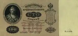 Qiang tie (Chinese: 羌帖; pinyin: qiāng tiē) is a Chinese folk name for banknotes of the Russian ruble issued by the Russian Empire and later by the White Army. The main regions of ruble transactions in China were concentrated along the Chinese Eastern Railway and Harbin in Manchuria and Ili and Tacheng in Xinjiang.[1] Russian currency in China began circulating in the 1860s and were withdrawn due to severe depreciation in the mid-1920s. There were many qiang tie sources, including the State Bank of the Russian Empire, the Russian Provisional Government, Omsk bonds issued by the Provisional All-Russian Government, the Russo-Chinese Bank, and the administration of the Eastern Railway.[2]