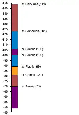 The phrase quaestiones perpetuae comes from Cicero, specifically in his history of Roman oratory, titled Brutus.[3] The first permanent jury court in Rome was formed in 149 BC with the passage of the lex Calpurnia de repetundis by the plebeian tribune Lucius Calpurnius Piso Frugi. Some historians believe that the first permanent courts were established earlier (perhaps in 159 BC) or later (with Gaius Gracchus' laws) but this is not supported by Ciceronean evidence.[4] The main innovation of Piso's was to establish a specific type of action and to make it possible at any time to bring charges: unlike with the trials before popular assemblies, which could only be convoked by a sitting magistrate, any citizen in good standing could bring charges that fell within the court's remit at any time.[5]