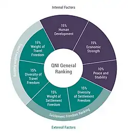 The QNI takes a quantitative approach to determine the value of a nationality based on seven parameters, comprising both internal value (40%) and external value (60%). Three parameters reflect the internal value of a nationality: human development (15%), economic strength (15%), and peace and stability (10%). Four parameters reflect the external value of a nationality: diversity of travel freedom (15%), weight of travel freedom (15%), diversity of settlement freedom (15%), and weight of settlement freedom (15%).[8]