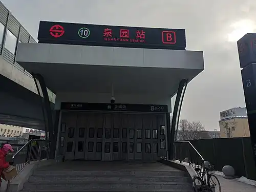 Quanyuan (Chinese: 泉园站; pinyin: Quányuán Zhàn) is a station on Line 10 of the Shenyang Metro.[1] The station opened on 29 April 2020.[2]