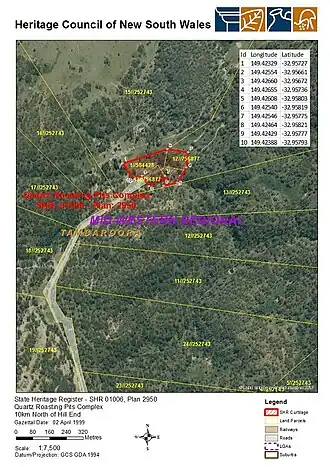 - ^ a b c d e f g h i j k l m n o p q r s t u v w x y z aa ab ac ad ae af "Quartz Roasting Pits Complex". New South Wales State Heritage Register. Department of Planning & Environment. H01006. Retrieved 2 June 2018.