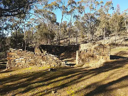 The Battery sits on the valley floor about 20m below the Roasting Pits. It was here that the ore was crushed after roasting. The placement of the Battery on Fighting Ground Creek provided an area for tailings run off and access to a ready supply of water which was fed from the Dam further upstream. Locating it directly below the Roasting Pits also assisted the movement of the roasted ore from one stage of the extraction process to the next. The Battery is a large structure containing two main spaces and a solid stone platform containing several voids or spaces for machinery. It is oriented approximately north-south along its long axis, roughly parallel to the creek bank and across the slope leading down from the Roasting Pits. The western side of the building is cut into the slope, while the eastern is built onto the flat creek terrace.[1]