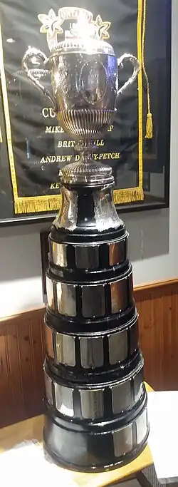 As a challenge trophy, the cup is competed between two clubs: one that currently holds the trophy, and the club that is challenging for it. The competition involves a 10 end "double rink" curling game, where both clubs field two teams to play against the opposing club.[3] The final results are based on cumulative scoring on the two sheets. In the case of a tie, the team that is defending the trophy retains it.[4] The defending team hosts the challenge.[5] There are currently 52 clubs that compete for the trophy, and nine challenges per season,[6] which occur every two to three weeks.[7] Clubs must follow the rotation schedule to compete for the trophy,[3] meaning a wait of 5–7 years per challenge.[1]