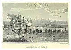 The previous bridge on this site was the Long Bridge, which began construction in 1682, supposedly on the site of an ancient ford.[1] It had 21 arches, with a total span length of 840 feet (260 m) and a width of 20 feet (6.1 m), although its long approach from the east made it almost a mile long.[2] The bridge was rebuilt several times over the years, such as in 1692 when seven arches collapsed when it was rammed by a ship (possibly because it had been weakened in 1689 when the Duke of Schomberg's troops transported their cannons over it).[3] By 1830, traffic volumes were increasing and a wider bridge was required, so the intention to build a new bridge was announced. The Long Bridge was not demolished until work on the new bridge began and it is shown on the 1833 Ordnance Survey map.[2]