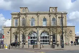 The Queen's Building is a grade II listed building in Wolverhampton in the West Midlands of England. Built in 1849 as the carriage entrance to Wolverhampton railway station, it opened three years before the station itself.[1] The two buildings were built in a similar style, but the station building was replaced in the 1960s.[1] The Queen's Building has not been used as the carriage entrance for many years but functions as part of the city's bus station up to date.[1]