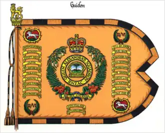 Queen Alexandra's Mounted Rifles has 36 battle honours, though only 22 battle honours are shown on the Guidon. The battle honours of the unit which have been approved for emblazonment appear on either side of the central emblem in small gold scrolls, their chronology being from left to right, beginning at the top with the exception of the battle honours "New Zealand" and "South Africa 1899–1902", which appear beneath the unit motto.
