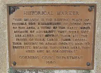 Queen City was all but forgotten, and not a significant part of written Adams County history, until Lake Binder was created as a water supply for nearby Corning. When the lake was dug, some tombstones and an estimated 200 gravesites were found. The remains and gravestones were moved to a new location, today just north of the lake, where a monument was built marking the abandoned town in 1980.[7]