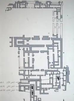 This excavation began in 1989, and it was when the archeological identification and labeling system was switched from letters to numbers. Hussein found another vaulted chamber, Tomb II, near rooms 44, 49, 51, and 59.[3] This chamber, too, was made of baked brick and stone, while the floor was made of marble slabs, and was closed off by two stone slabs that were likely held together by an iron bar.[3]